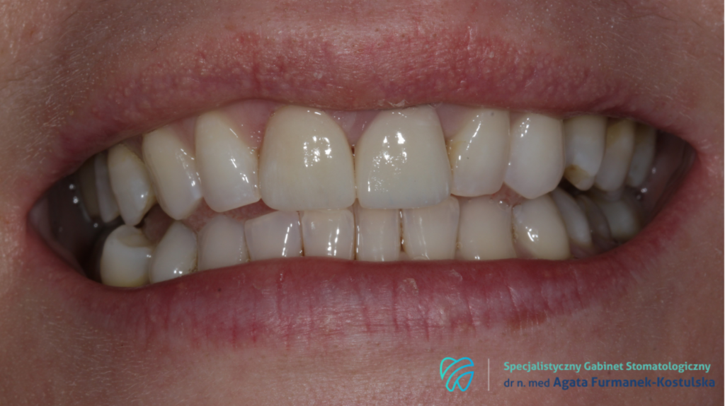 Zastosowaliśmy tutaj chirurgię najwyższej próby: podczas jednego zabiegu wykonaliśmy ekstrakcję zęba z torbielą oraz jednoczasową implantację! Aby zapewnić stabilność implantowi, musieliśmy odbudować przedsionkową blaszkę kostną. Wykorzystaliśmy do tego najdoskonalszy materiał – własną kość pacjentki, pobraną z obszaru guza szczęki. Dzięki tak zaawansowanej współpracy i regeneracji, pacjentka odzyskała piękny uśmiech, o który walczyła od dziecka. Ten skomplikowany zabieg chirurgiczny został wykonany wspólnie z dr n. med. Marcinem Adamieckim!